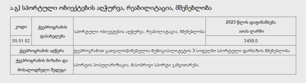 Այդուհանդերձ, 2023 թվականի բյուջեի երեք եռամսյակի հաշվետվությունից որոշակի գաղափար կարելի է կազմել։ 2023 թվականին մինչև սեպտեմբեր ընկած ժամանակահատվածում սպորտային ենթակառուցվածքների կառուցման համար հատկացվել է բյուջեի ընդհանուր գումարի 2,2 տոկոսը։