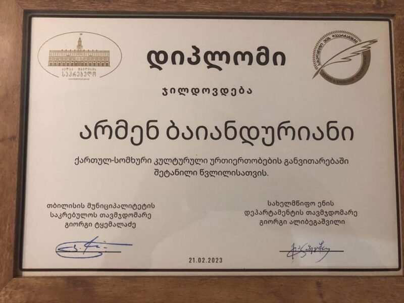 Թբիլիսիի Պետրոս Ադամյանի անվան հայկական դրամատիկական թատրոնի գեղարվեստական ղեկավար Արմեն Բայանդուրյանը պատվոգրի է արժանացել վրաց֊հայկական մշակութային կապերի զարգացման գործում ունեցած մեծ ավանդի համար:
