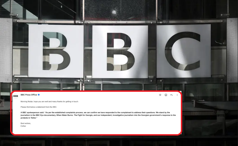 «Բողոքների քննարկման հաստատված գործընթացի համաձայն հաստատում ենք, որ պատասխանել ենք հայցվորին՝ անդրադառնալով նրա հարցերին: Մենք պաշտպանում ենք BBC Eye-ի «Երբ ջուրն այրվում է. պայքար Վրաստանի համար» փաստավավերագրական ֆիլմում հրապարակված լրագրությունը և մեր անկախ հետաքննական աշխատանքը, որը վերաբերում էր Վրաստանի կառավարության արձագանքին Թբիլիսիի բողոքի ցույցերին», — նշել է BBC-ն TV Pirveli-ին ուղղված նամակում: