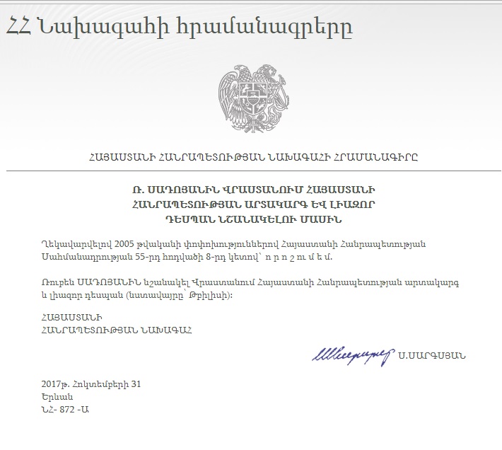 ამავე გვერდზე გავრცელებული მეორე განკარგულების თანახმად, რუბენ სადოიანი საქართველოში სომხეთის რესპუბლიკის საგანგებო და სრულუფლებიან ელჩად დაინიშნა.