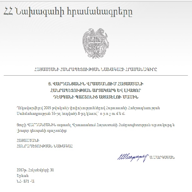 სომხეთის პრეზიდენტის ოფიციალურ გვერდზე გავრცელებული განკარგულების თანახმად, სომხეთის პრეზიდენტმა იური ვარდანიანი საქართველოში სომხეთის რესპუბლიკის საგანგებო და სრულუფლებიანი ელჩის თანამდებობიდან გაათავისუფლა.