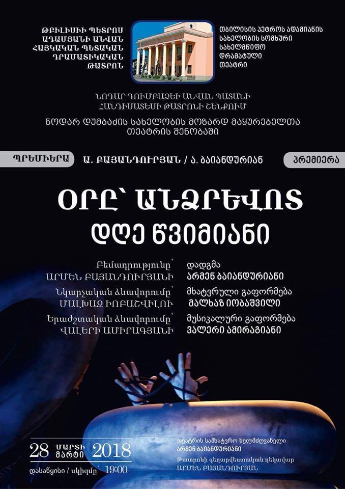 28 მარტს, ნოდარ დუმბაძის მოზარდ მაყურებელთა თეატრის შენობაში შედგება თბილისის პეტროს ადამიანის სახელობის სომხური სახელმწიფო დრამატული თეატრის სამხატვრო ხელმძღვანელის, არმენ ბაიანდურიანის სპექტაკლის “დღე წვიმიანი” პრემიერა.