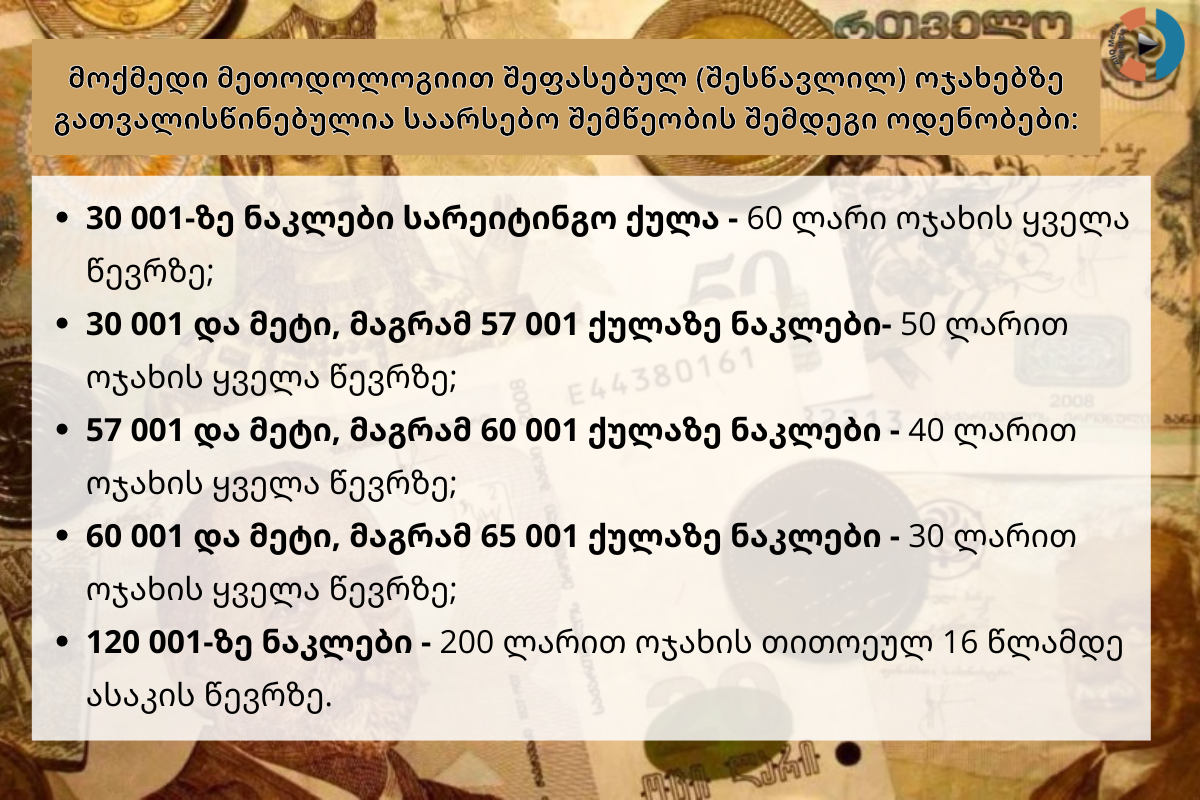 მოქმედი მეთოდოლოგიით შეფასებულ (შესწავლილ) ოჯახებზე გათვალისწინებულია საარსებო შემწეობის შემდეგი ოდენობები: