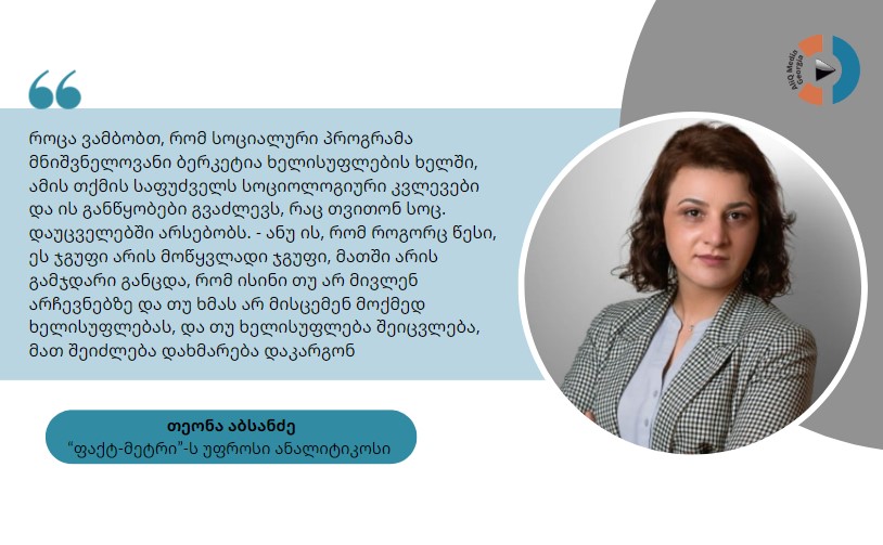 “როცა ვამბობთ, რომ სოციალური პროგრამა მნიშვნელოვანი ბერკეტია ხელისუფლების ხელში, ამის თქმის საფუძველს სოციოლოგიური კვლევები და ის განწყობები გვაძლევს, რაც თვითონ სოც. დაუცველებში არსებობს. – ანუ ის, რომ როგორც წესი, ეს ჯგუფი არის მოწყვლადი ჯგუფი, მათში არის გამჯდარი განცდა, რომ ისინი თუ არ მივლენ არჩევნებზე და თუ ხმას არ მისცემენ მოქმედ ხელისუფლებას, და თუ ხელისუფლება შეიცვლება, მათ შეიძლება დახმარება დაკარგონ”- ამბობს აბსანძე.