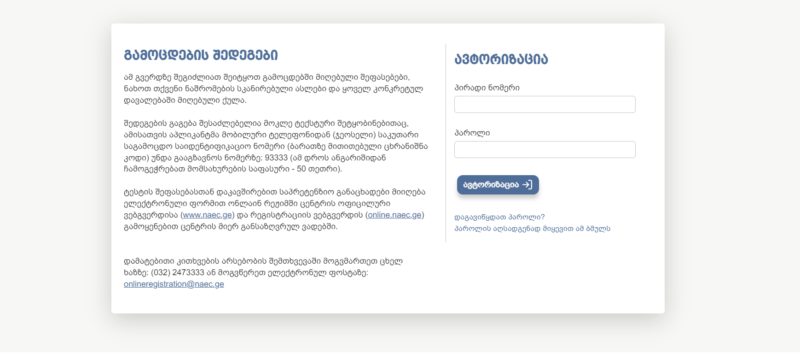 Միասնական ազգային քննություններում արդյունքը պարզելու համար դիմորդը պետք է մուտք գործի https://online2.naec.ge/uee-res/ կայք և առաջին դաշտում նշի իր անձնական համարը, իսկ երկրորդ դաշտում հնգանիշ գաղտնաբառը (գաղտնաբառը դիմորդը գրանցման ժամանակ ստացել է հաղորդագրության տեսքով, նաև այն նշված է քննաթերթիկի վրա)։