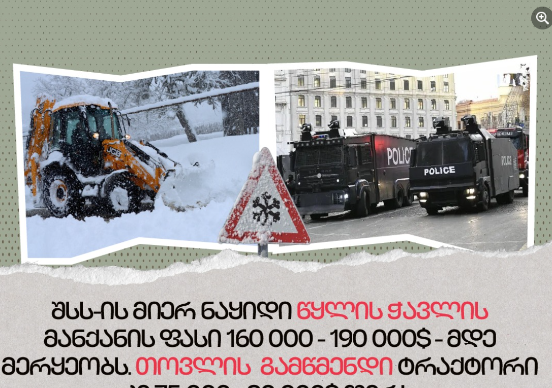 Վրաստանյան iFact հետաքննող լրագրողների միությունը համեմատություն է արել ներքին գործերի նախարարության (ՆԳՆ) կատարած ծախսերի մասին: iFact-ի տեղեկության համաձայն, ՆԳՆ-ի կողմից ցույցերը բռնի կերպով ցրելու ջրցան մեքենաների արժեքը կազմում է 160 հազարից մինչև 190 հազար դոլար, իսկ ահա ձնամաքրման տեխնիկայի գնումը՝ 75 հազարից 90 հազար դոլար: