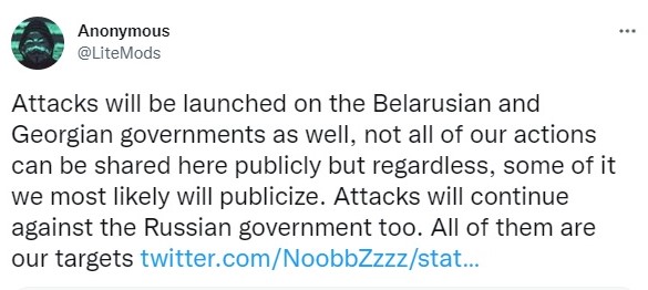 «Հարձակումներ կիրականացվեն նաև Բելառուսի և Վրաստանի կառավարությունների վրա: Մեր գործողությունները չեն կարող հանրայնացվել, բայց մենք դրանցից մի քանիսը կհրապարակենք: Հարձակումները Ռուսաստանի կառավարության վրա կշարունակվեն: Դրանք բոլորը մեր թիրախն են»,- գրել է Anonymous-ը Twitter-ում: