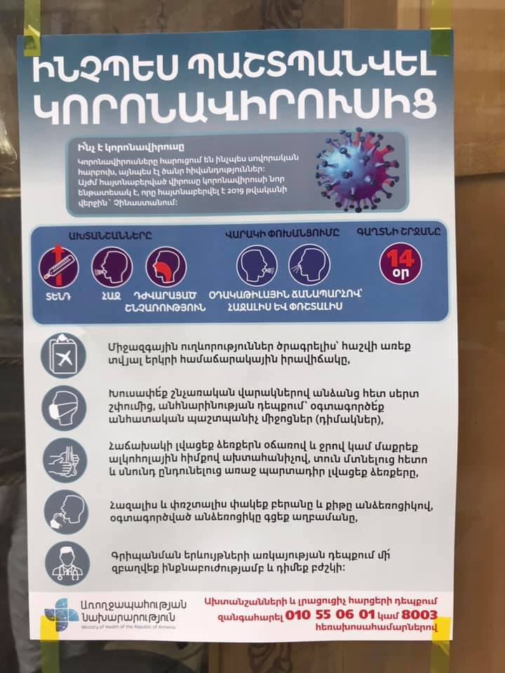 Հայաստանում էլ դեռևս հունվարի 30-ին վարչապետի որոշմամբ՝ երկրում կորոնավիրուսի տարածումը կանխարգելող աշխատանքների համակարգման նպատակով փոխվարչապետ Տիգրան Ավինյանի նախագահությամբ ստեղծվել էր միջգերատեսչական հանձնաժողով։