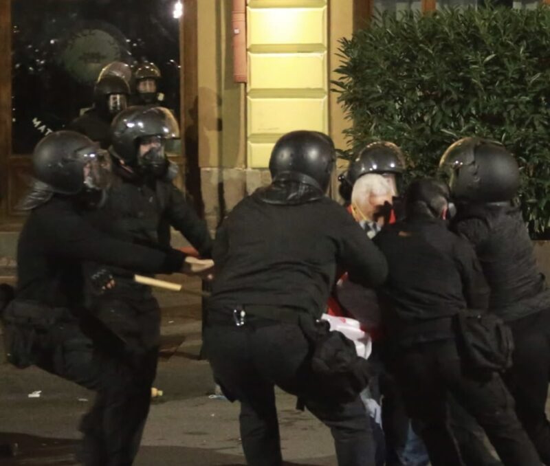 Հիշեցնենք, այս պահին Թբիլիսիում լարված իրավիճակ է. բողոքի ցույցին զուգահեռ՝ Աթոնելիի փողոցում տեղակայված նախագահական պալատի բակում բախումներ են տեղի ունենում քաղաքացիների ու հատուկջոկատայինների միջև. ՆԳՆ-ն պղպեղի սփրեյ, ջրցան մեքենա, ֆիզիկական բռնություն է կիրառել ցույցը ցրելու նպատակով, կան վիրավորներ, նրանց թվում՝ ցույցի կազմակերպիչ Պաատա Բուրճուլաձեն: Կան նաև բերման ենթարկվածներ: