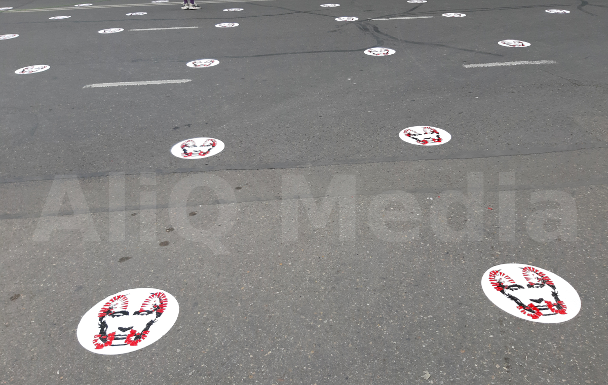 Պուտինին պատկերող պիտակներով գծանշումներ՝ սոցիալական հեռավորություն պահպանելու համար