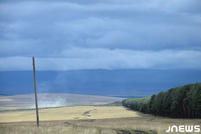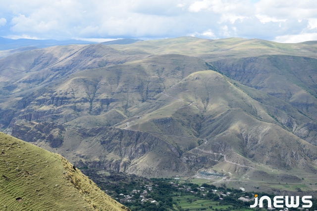 Бесконечно распластались горные пейзажи и рыжие поля собранной пшеницы и сена, зеленые леса и, закрашенное цветом неба, озеро Зрес. Красота природы отвлекает от длинной и находящейся в ужасном состоянии дороги, ведущей в село Гумбурдо.