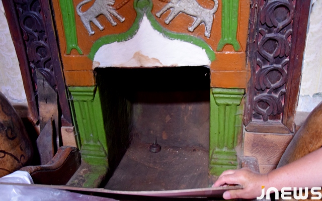 “Раньше к нам в оду много гостей приходило посидеть. Приходили старики и с моим свёкром сидели, играли в карты, в нарды и другие игры, разговаривали, согревая ноги у этой печки. А печку я нашла случайно. Я когда только замуж вышла, был новый год, и я за три дня начала убираться, как принято у нас. Убиралась и случайно нашла эту печку, которую моя свекровь замазала под толстым слоем гипса. Она знала про неё. Там был черный камень, где была резьба. Мы нефтью почистила, потом закрасили в разные цвета с сыном моей золовки. Там два льва. Свёкр этих львов, что изображены на печке, назвал Аслан и Хаплан. А над ними канатоходец на канате”, – рассказывает Варвара Варданян.
