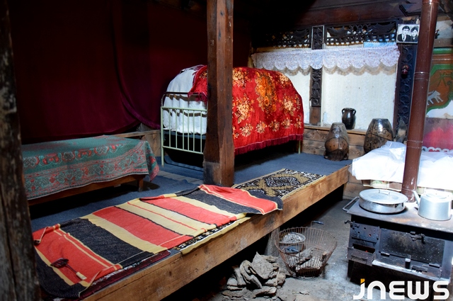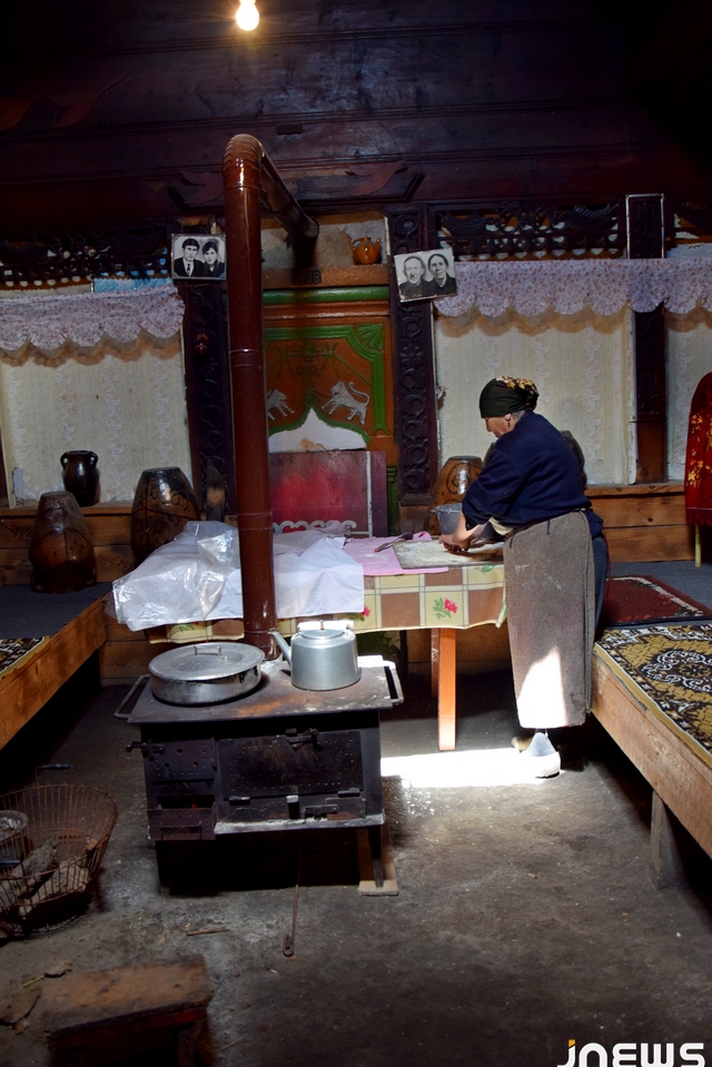 Большая по тем меркам комната, с деревянным потолком, украшенная рукодельной деревянной резьбой, уникальна и красива. И в разное время дня узоры потолка принимают разные оттенки коричневого. Хозяева своими силами сохраняют древесину от прогнивания, покрывая поверхность бесцветным лаком. Деревянные навесы в свое время служили кроватями, так все члены одной семьи спали на одной “кровати”. Комнату освещает только маленькое отверстие на потолке, создавая интересную историческую атмосферу.