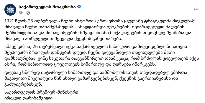 Facebook-ում Վրաստանի կառավարության պաշտոնական էջը տարածել է վարչապետ Իրակլի Ղարիբաշվիլիի հայտարարությունը, որում չի նշվում Ռուսաստանը, իսկ 102-ամյա օկուպացիան գնահատվում է որպես «ողբերգական իրադարձություն»։