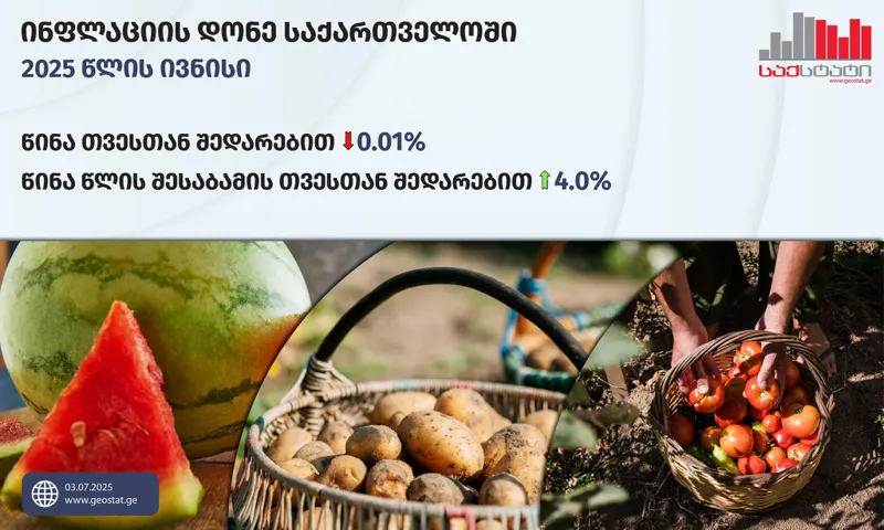 Վրաստանի ազգային վիճակագրական ծառայության տվյալներով՝ 2025 թվականի հունիսին Վրաստանում գնաճի մակարդակը նախորդ ամսվա համեմատ կազմել է -0.01 տոկոս, իսկ տարեկան գնաճի մակարդակը՝ 4.0 տոկոս։