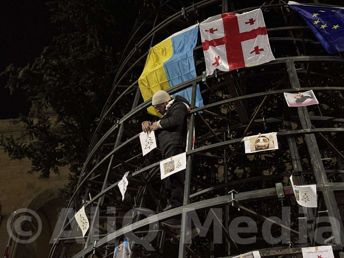 Թբիլիսիում մաքրման ծառայության աշխատակիցները խորհրդարանի շենքի մոտ տեղադրվող տոնածառի երկաթյա կառույց վրայից հանել են ծեծված քաղաքացիների լուսանկարներն ու դեն նետել։