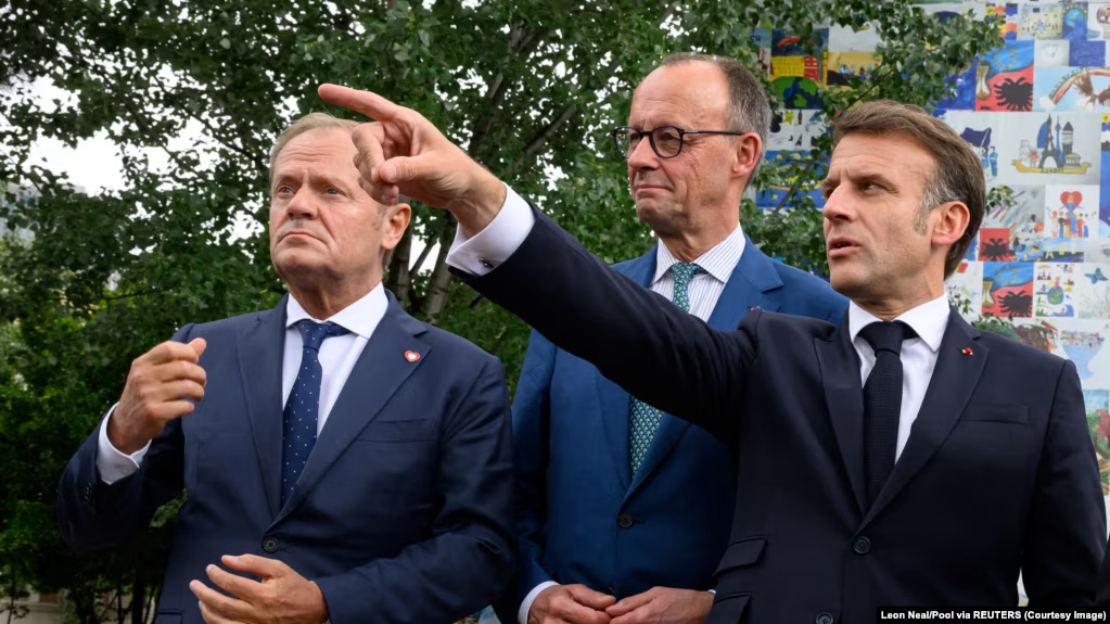 Ֆրանսիայի նախագահ Էմանուել Մակրոնի, Լեհաստանի վարչապետ Դոնալդ Տուսկի և Գերմանիայի կանցլեր Ֆրիդրիխ Մերցի համատեղ հայտարարությունը սկսվում է վրաց ժողովրդին ուղղված խոսքով.