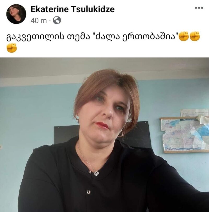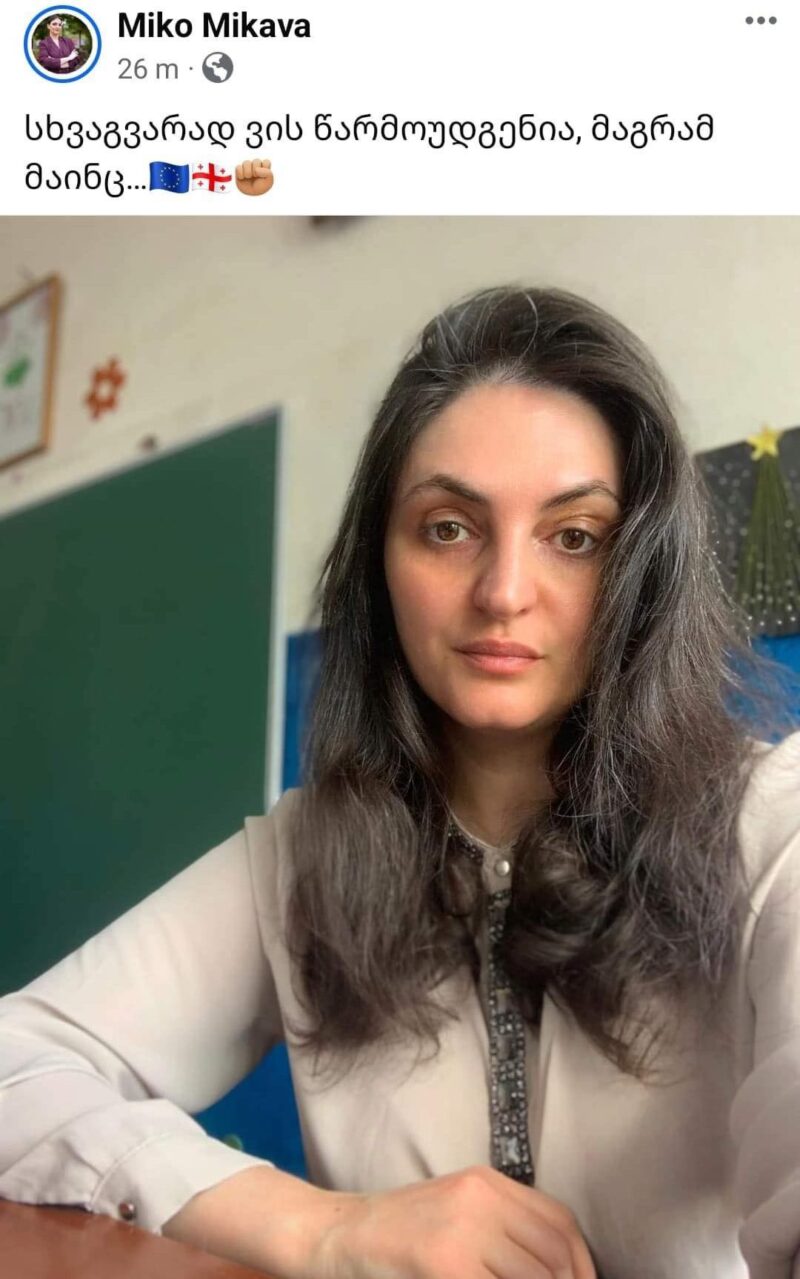 «Սոցիալական արշավներ շատ ենք իրականացնում այս օրերին, բոլորս լարված ենք, բոլորս փորձում ենք որևէ կերպ մեր խոսքը հասցնել մեծ լսարանին, պայքարել ռուսական օրենքի ընդունման դեմ, ուսուցչի դեպքում, կարելի է ասել, դա համարձակ քայլ է, քանի որ դպրոցների քաղաքականացման փաստը մեծ մարտահրավեր է մեր պետության համար, բայց այսօր հատկապես կարևոր է ցույց տալ, որ մենք հավատարիմ ենք եվրոպական արժեքներին` չմիանալով բողոքի ցույցին, որտեղ մարդկանց իրենց կամքին հակառակ են տանում», — նշեց Կավթուաշվիլին։