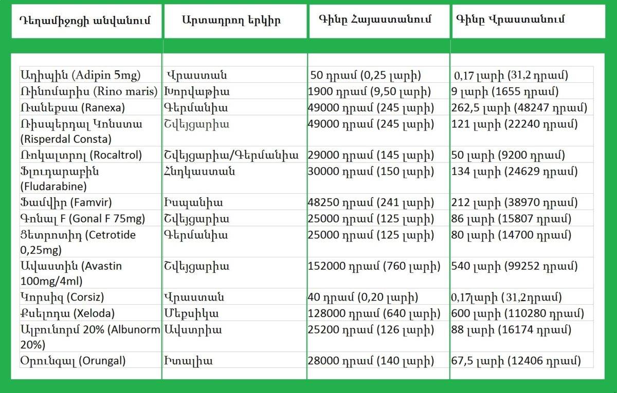 «Ալիք մեդիան» փորձել է պարզել նույն դեղամիջոցի գինը Հայաստանում և Վրաստանում: Ստորև ներկայացնում ենք մոտավոր գնացուցակը և արտադրող երկիրը.
