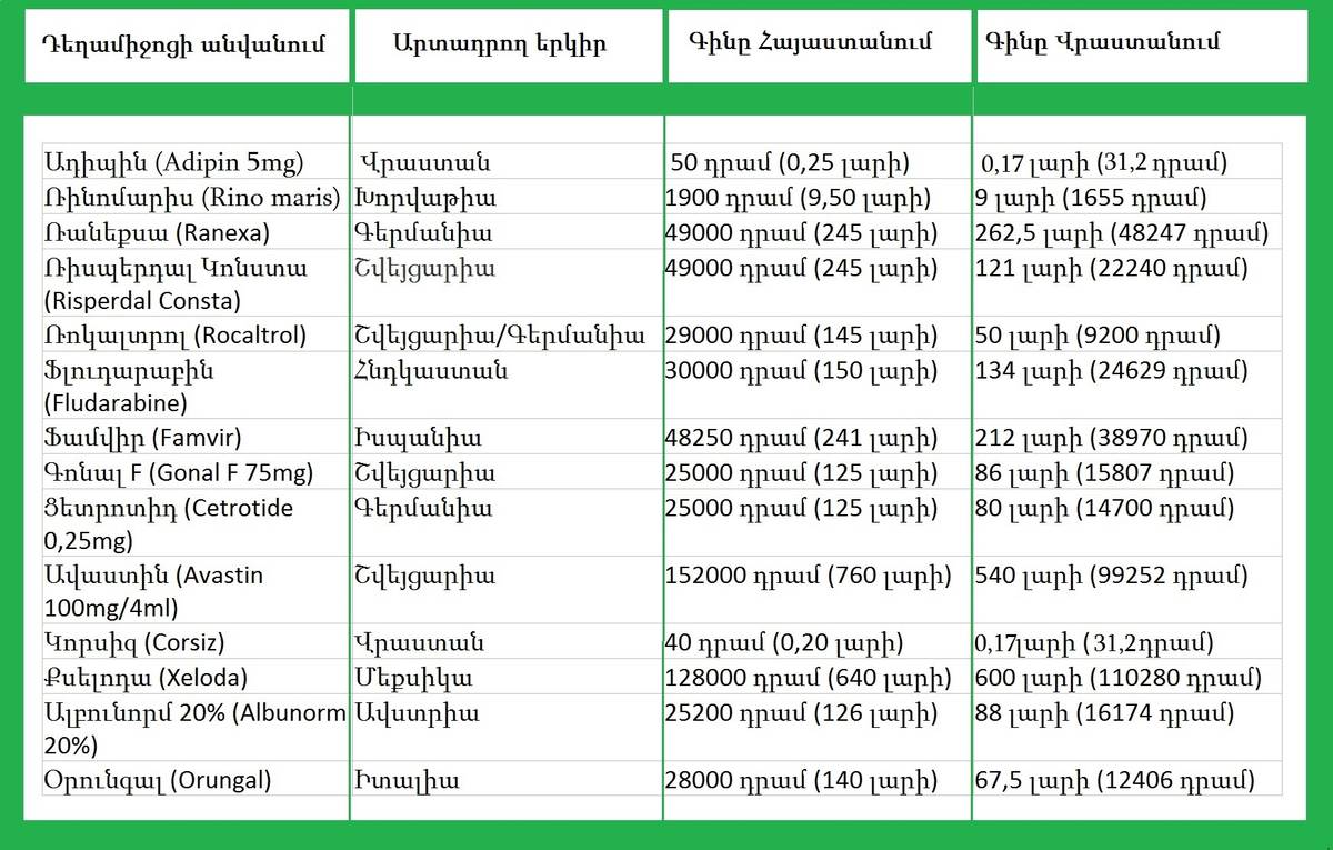 Նշենք, որ գնային էական տարբերություններ կան թանկարժեք դեղամիջոցների միջև, իսկ այնպիսի դեղամիջոցների, ինչպիսիք են մրսածության, ջերմության, հազի և կոկորդի ցավի, կամ էլ ճնշման, ալերգիայի դեմ դեղերը, գնային տարբերությունը թեև կա, սակայն մեծ չէ: