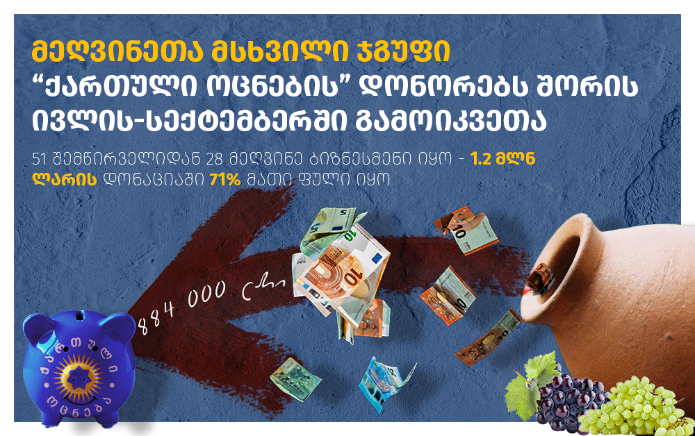 ՀԿ-ի պնդմամբ՝ «Վրացական երազանքի» 51 նվիրատուներից 28-ը գինեգործներ են: Իշխող թիմի 1,2 միլիոն նվիրատվությունների 71 տոկոսը հենց գինեգործների գումարներն են: