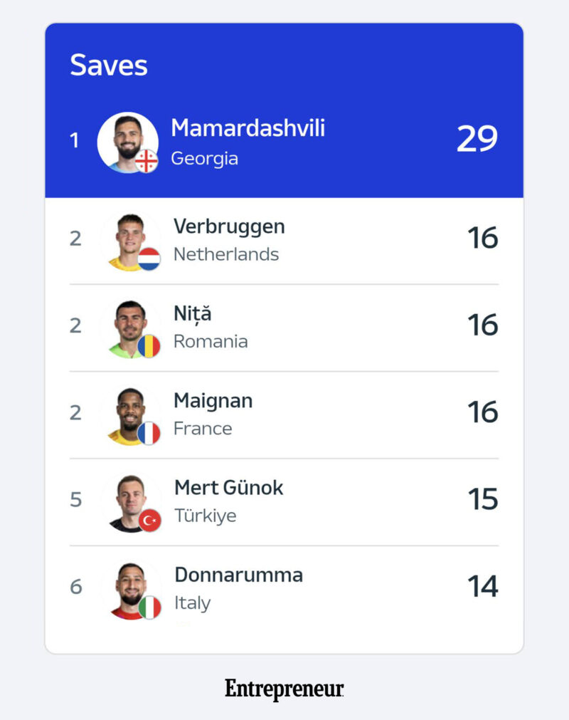 Վրաստանի հավաքականի դարպասապահ Գիորգի Մամարդաշվիլին, ըստ ՈւԵՖԱ-ի պաշտոնական կայքի, անցկացրած չորս ֆուբոլային հանդիպումներում պահել է 29 գոլ և մտել Եվրոպայի առաջնության պատմության մեջ։