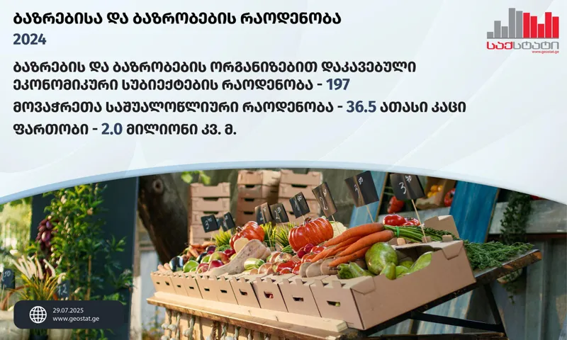 Վրաստանի ազգային վիճակագրական ծառայության հաղորդմամբ՝ 2024 թվականին Վրաստանում գործել է շուկաների կազմակերպմամբ զբաղվող 197 տնտեսվարող սուբյեկտ: