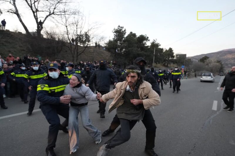 Tbilisi Mall-ի մոտ անցկացվող ցույցի ժամանակ բերման ենթարկվածներին ոստիկանությունը տանում է Հատուկ առաջադրանքների վարչության պետ Զվիադ Խարազիշվիլիի («Խարեբա») մոտ. վերջինս ֆիզիկական բռնության է ենթարկում քաղաքացիներին։